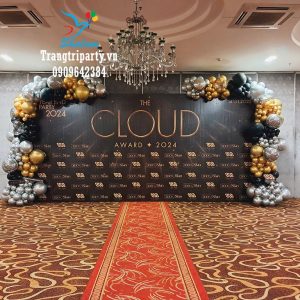 Trang trí khung backdrop tiệc tất niên công ty tại nhà hàng. Kích thước backdrop 6m x 3m được thiết kết và trang trí theo tone màu đen, vàng đồng và bạc.