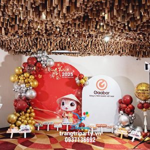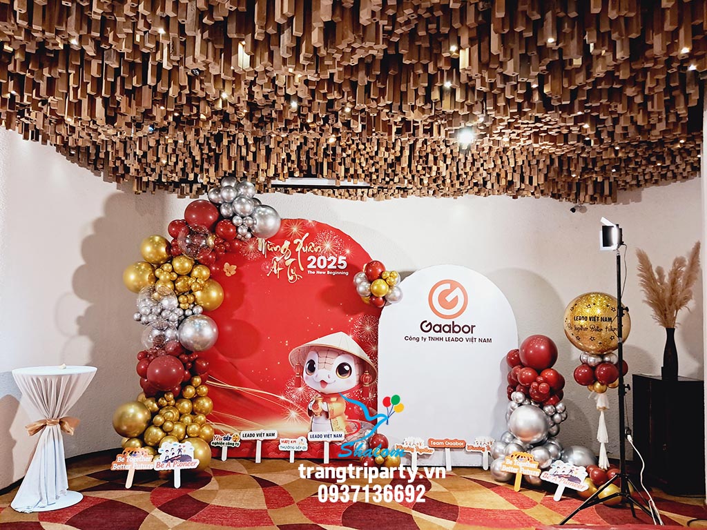 Trang trí tiệc mừng xuân năm mới cho công ty theo yêu cầu về mẫu, kích thước và màu sắc. Các tone màu đỏ, trắng, vàng đồng và bạc phối với nhau rất nổi bật.